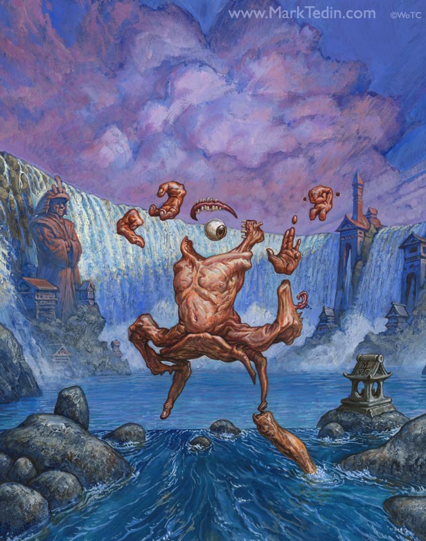 Acrylic Gouache on Board. Well, here's the piece in full. It was actually the first of the "Kami" pieces I worked on, but painted it right up until the deadline. I was both vexed and intrigued by the concept of this world's spirits. I wanted to do something honestly weird, and though it took quite a few sketchbook pages before I landed on something I liked, I thought it was worth it. Basically the Kami is trying to look something close to a human, but failing miserably. Although I knew the piece would be cropped, I couldn't resist in making the format something a little more complicated than usual, so I made the piece much taller. |